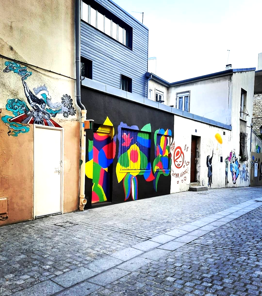 Cette fresque est visible au passage du Moulins des près, dans le quartier de la butte aux cailles, Paris 13ème. Réalisée en 2020.
